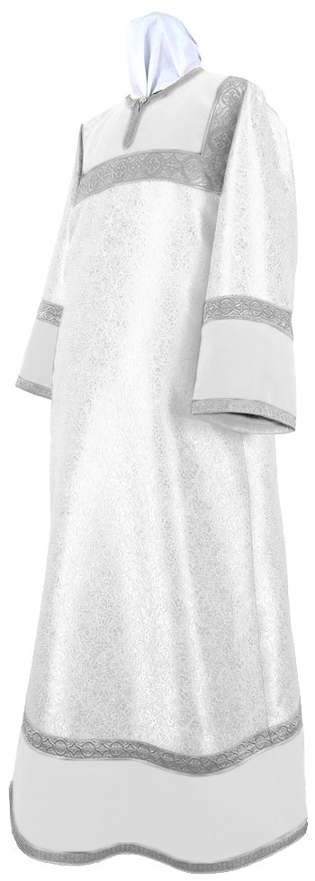 Altar server robe (stikharion, alb). Metallic jacquard brocade, class BG4. Please send us your measurements per our Measurement Chart. Please note that picture for this product is a sample one. If you would like specific fabric (in the same fabric class as this product) to be used for your order, please review Fabrics section and make a note in the Notes field of your order (at the last order placing page) which fabric you prefer. Economy vestment type (Ec) means decoration with inexpensive gallon (usually Indian) and non-embroidered crosses or crosses with inexpensive embroidery (at our discretion). For Standard style (St) we use good quality solid galloon and richly embroidered crosses. Premier stile (Pr) means decoration with excellent hand-embroidered crosses and solid jacquard galloons. For all vestments we use natural rayon lining (no synthetics). Excellent quality natural velvet is used for inserts. By default, we make this item with closed sides, i.e. for untonsured persons. So called Deacon's stikharions, i.e. with open buttoned sides are worn by persons who have canonical right (Anth. 5; Laod. 19; VI 69) to be in the altar (Deacon, Subdeacon, Reader and Singer). Washing & Care Instructions: we recommend dry cleaning, no bleach, low temperature ironing inside out. |