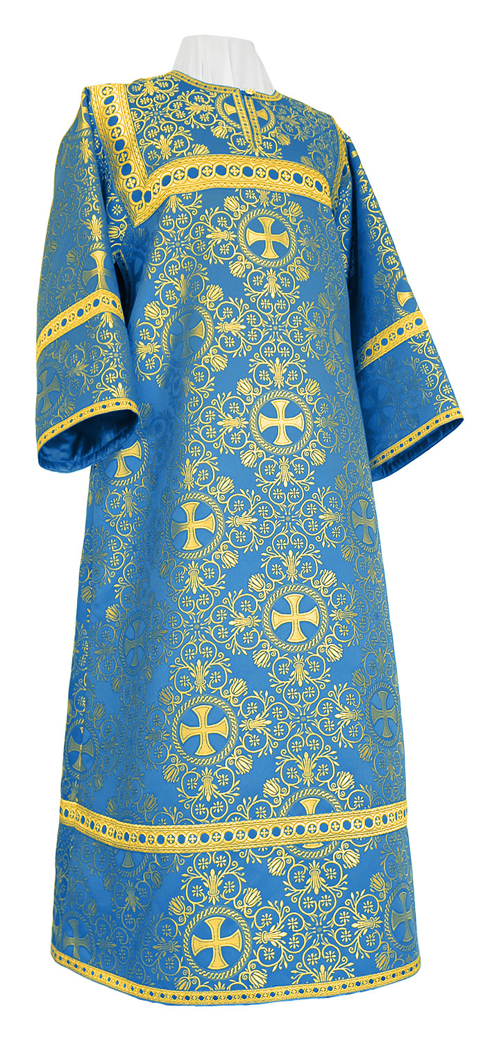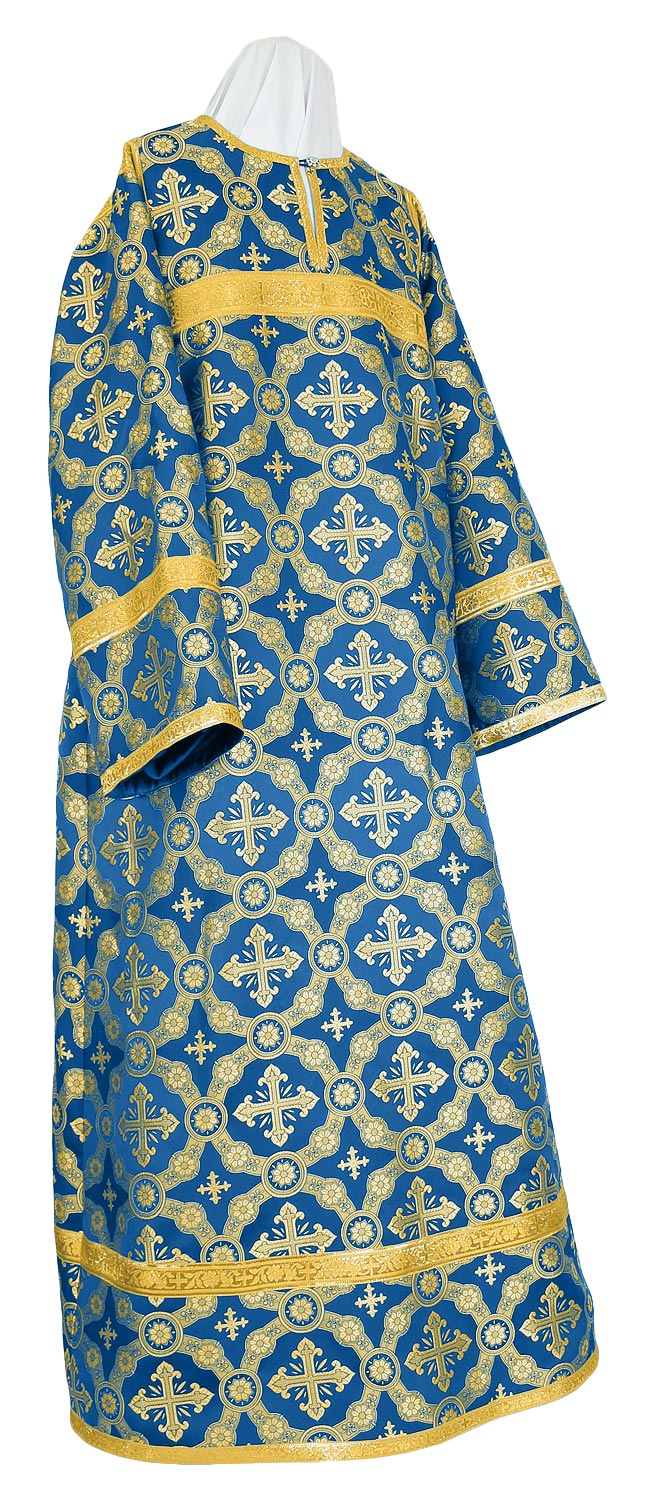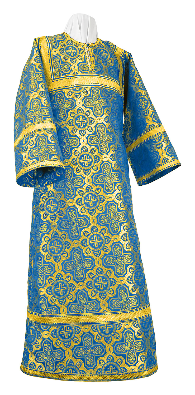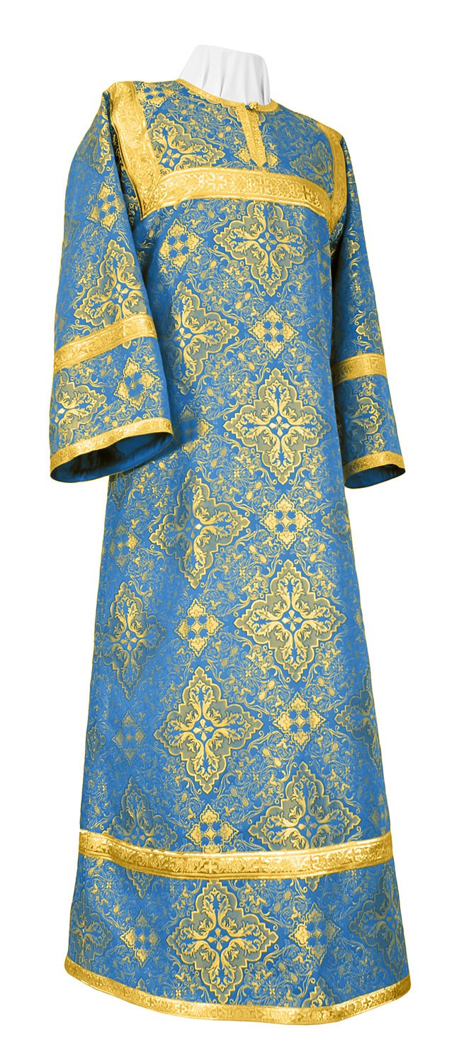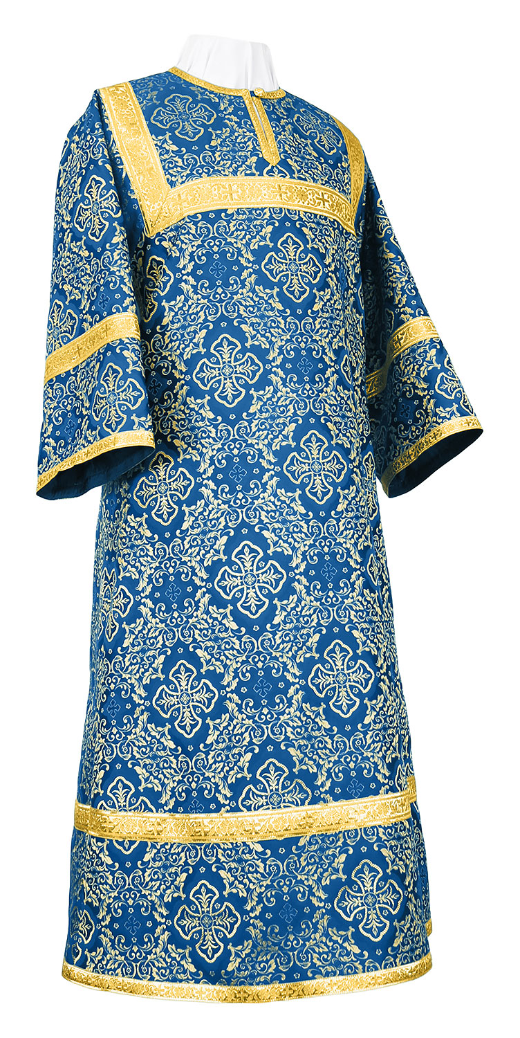 Altar server robe (stikharion, alb). Rayon jacquard brocade, class S3. Please send us your measurements per our Measurement Chart. Please note that picture for this product is a sample one. If you would like specific fabric (in the same fabric class as this product) to be used for your order, please review Fabrics section and make a note in the Notes field of your order (at the last order placing page) which fabric you prefer. Economy vestment type (Ec) means decoration with inexpensive gallon (usually Indian) and non-embroidered crosses or crosses with inexpensive embroidery (at our discretion). For Standard style (St) we use good quality solid galloon and richly embroidered crosses. Premier stile (Pr) means decoration with excellent hand-embroidered crosses and solid jacquard galloons. For all vestments we use natural rayon lining (no synthetics). Excellent quality natural velvet is used for inserts. By default, we make this item with closed sides, i.e. for untonsured persons. So called Deacon's stikharions, i.e. with open buttoned sides are worn by persons who have canonical right (Anth. 5; Laod. 19; VI 69) to be in the altar (Deacon, Subdeacon, Reader and Singer). Washing & Care Instructions: we recommend dry cleaning, no bleach, low temperature ironing inside out. |
