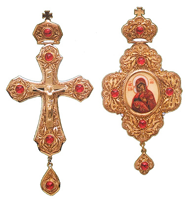 Orthodox Christian Bishop pectoral cross and panagia. Brass, finift, stones, filigree, hand work, casting, gold-gilding.