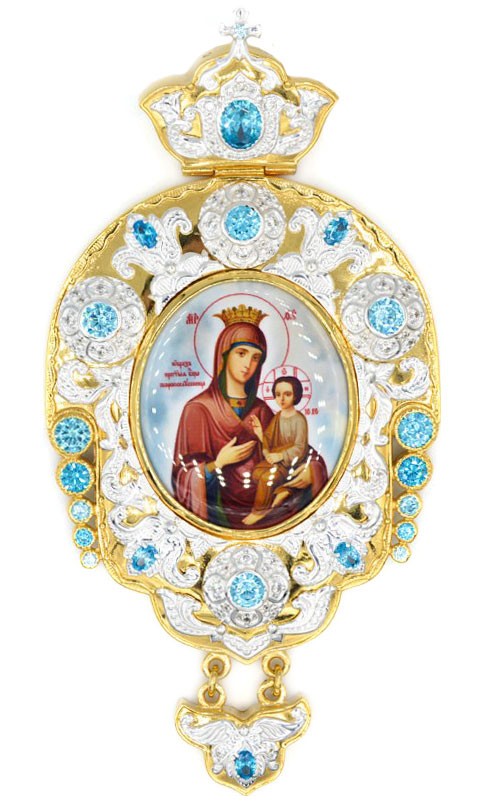 This Bishop's panagia is made of a special quality jewelry alloy specially created for the production of jewelry. Silver- and gold-gilding and radiating are applied by means of electroplating. This advanced technology allows you to apply a very reliable and durable coating. The panagia and chain are made with the help of exclusively manual labor. The icon is made by a special technology of applying a color image on a metal base and covered with a protective composition against color burnout and damage. According to your order, the image on panagia can be any. The front side of panagia is decorated with inserts of high-quality stones, cubic Zirconia and accented with radioanal. The product is sold in a presentable man-made package with a velvet bed. Size: 6.3'' (160 mm). Weight: 7.5 oz. (214 g).