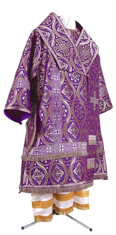 Bishop vestments. Metallic jacquard brocade, class BG3. Please send us your measurements per our Measurement Chart. Please note that picture for this product is a sample one. If you would like specific fabric (in the same fabric class as this product) to be used for your order, please review Fabrics section and make a note in the Notes field of your order (at the last order placing page) which fabric you prefer. Economy vestment type (Ec) means decoration with inexpensive gallon (usually Indian) and non-embroidered crosses or crosses with inexpensive embroidery (at our discretion). For Standard style (St) we use good quality solid galloon and richly embroidered crosses. Premier stile (Pr) means decoration with excellent hand-embroidered crosses and solid jacquard galloons. Lining - 100% natural rayon. For all vestments we use natural rayon lining (no synthetics). Excellent quality natural velvet is used for inserts. This set includes 8 items: sakkos (alb), belt (zone), epigonation (palitsa), epitralhilion, cuffs (epimanika), small omophorion, large omophorion, sulok. If you wish to order matching veils or Podsakkosnik (stikharion) for this set, you need to add them to you order from the corresponding section of our store. Please indicate in the Note section of your order that these veils must match the vestment set. Washing & Care Instructions: we recommend dry cleaning, no bleach, low temperature ironing inside out.