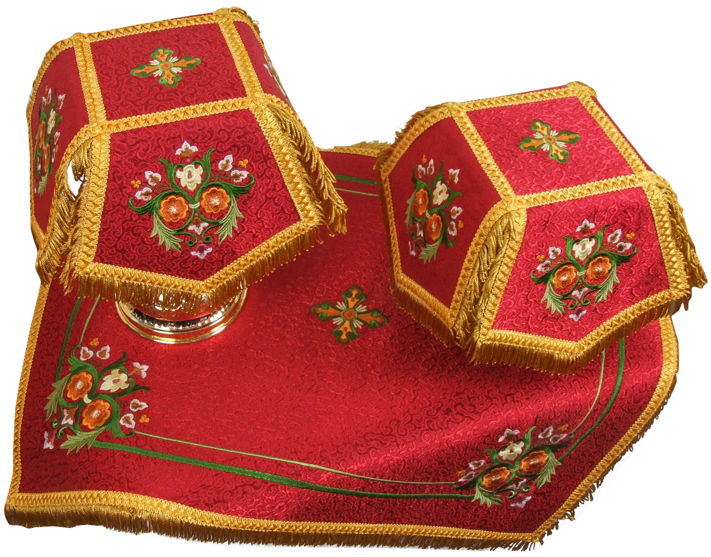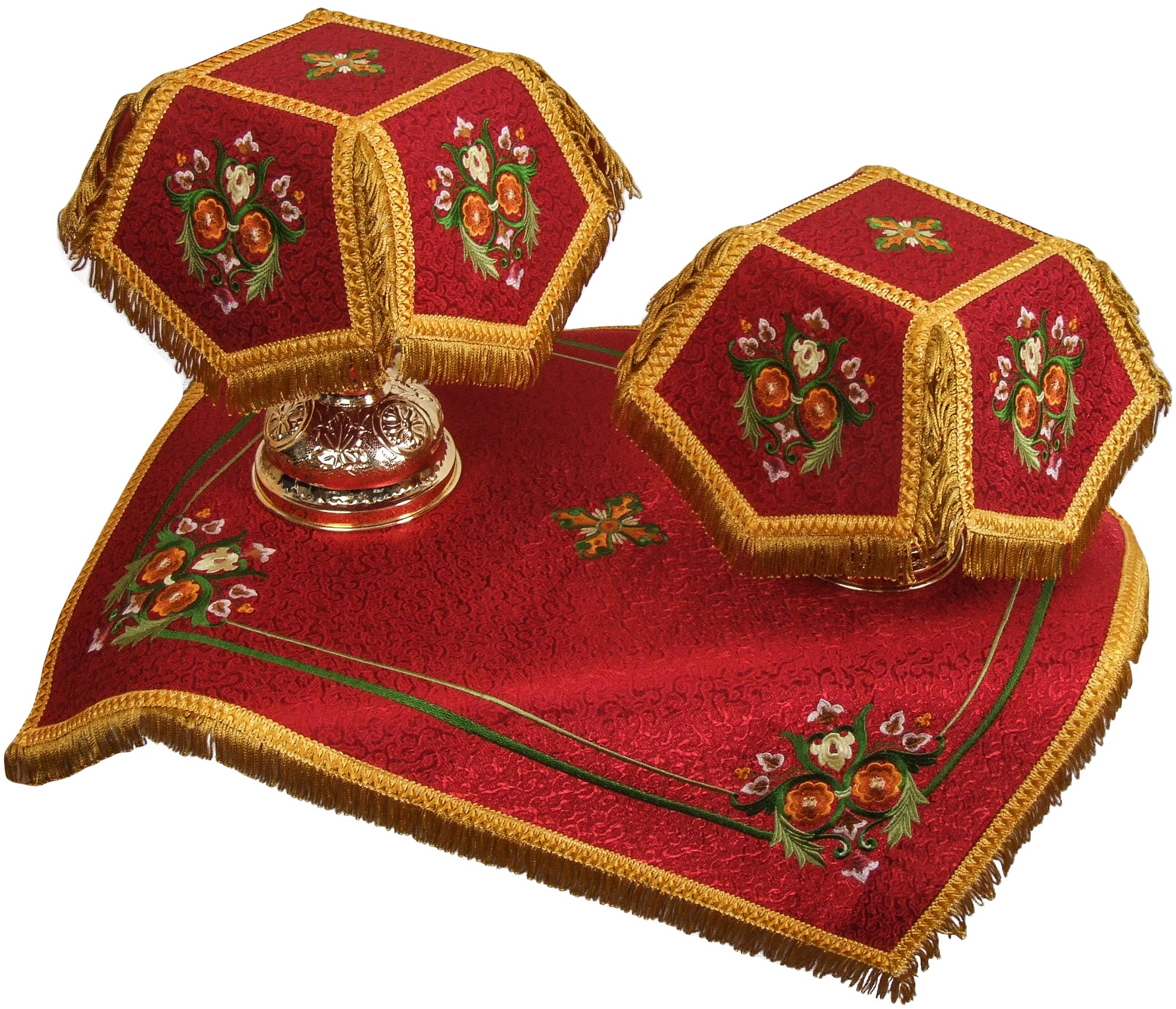 Excellent embroidered chalice covers and veil. Metallic brocade, German threads. By default, these veils are made for 0.25-0.5 L chalice. If you need this set made in different size, please let us know.