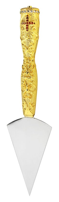 The handle of this traditional Orthodox Christian middle spear is manufactured of brass and covered with the quality galvanic gold-gilding. Such technology of drawing allows to keep the product in the original shape for a very long term. It is covered with a 3D floral ornament and decorated by inserts of qualitative stones cubic zirconias of a manual clip. The blade, with the convenient rounded edges, is made of steel and underwent additional sharpening. The product is packed into a presentable artificial leather gift box with a velvet lodgment. Size: 7.5''x3.5'' (190x89.46 mm). Weight: 3.2 oz. (89.46 g).