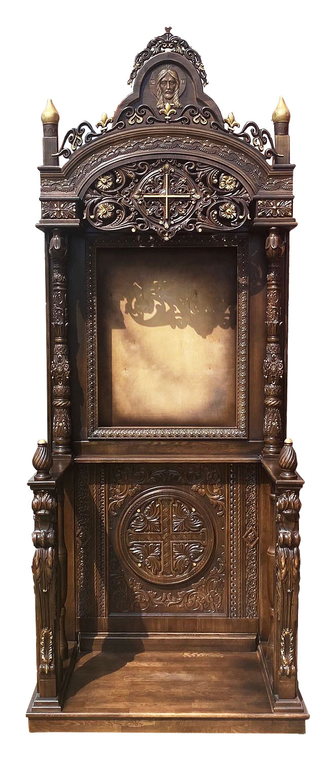 Traditional Orthodox Christian floor icon kiot. Solid oakwood, carving, wax, patina. Size: 47.2''x31.5''x129.9'' (120x80x330 cm).