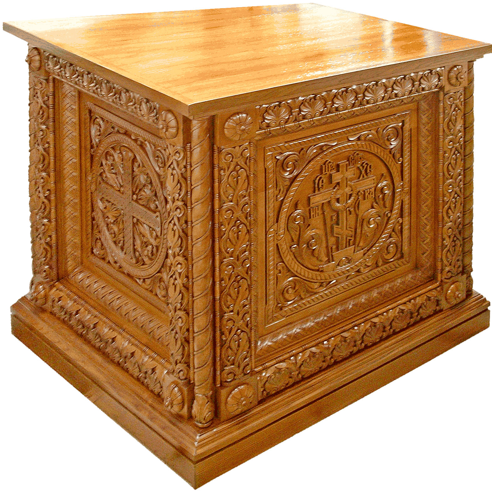 Beautiful traditional wooden carved Holy proskomedian table. Solid wood, carving, polishing, lacquering, painting, gold-plating. This item can be shipped only via Air Cargo. Please make sure you select this shipping option when placing your order. Size: 39.4''x39.4''x39.4'' (100x100x100 cm). |