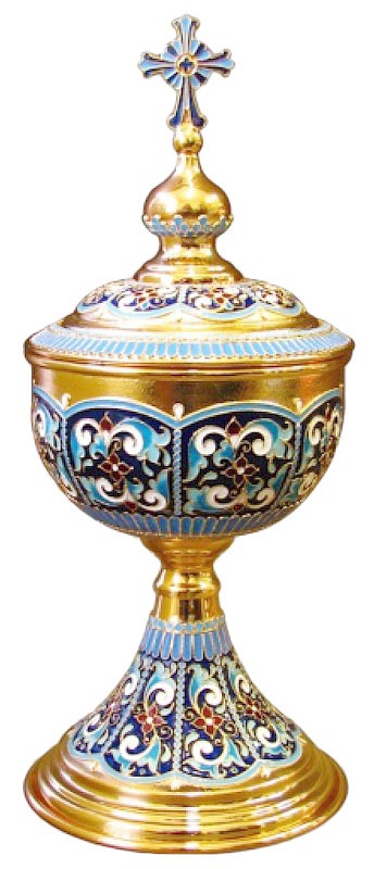 Jewelry vessel for Holy Particles. Brass, hand-painting, enamel, gold-gilding. Size: 5.1''x5.1''x12.2'' (13x13x31 cm).