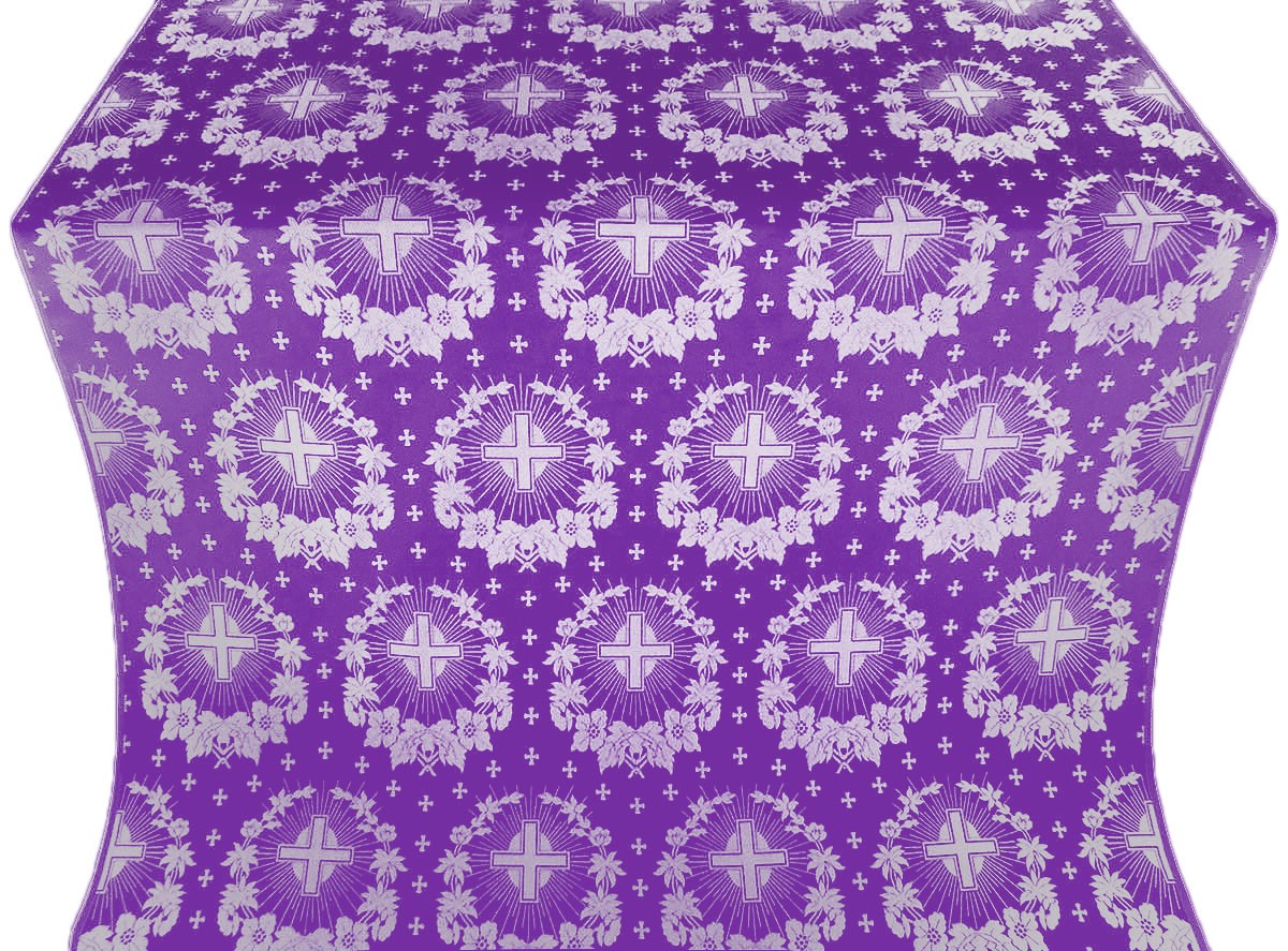 | Alpha-and-Omega silk (rayon brocade) (white/silver) | Bishop encolpion panagia no.91 | Peacocks metallic brocade (white/gold) |