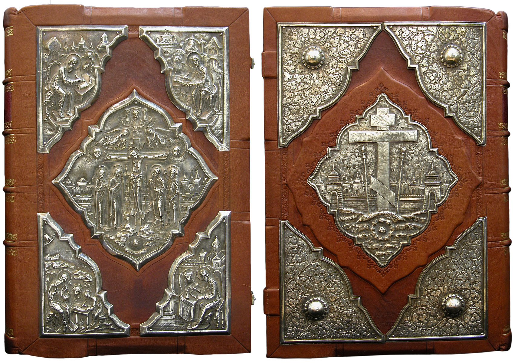 Service Gospel book. Natural high quality binding leather, brass, silver-plating