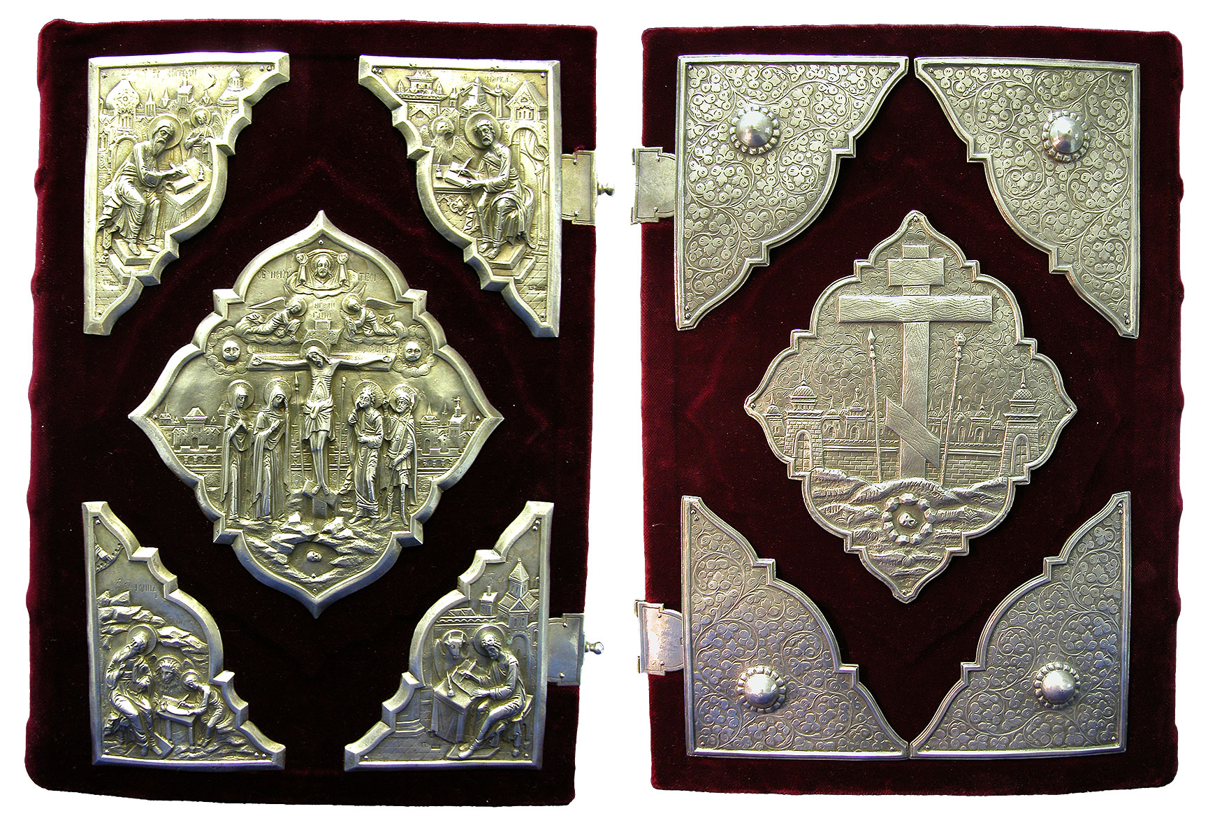 Service Gospel book in custom-made jewelry cover. Velvet, brass, silver-plating