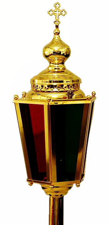 Traditional Orthodox Christian processional Paschal lamp. Brass, gold-gilding, glass. Custom sizing for candle holders is possible. Size: 9.1''x9.1''x22.8'' (23x23x58 cm).