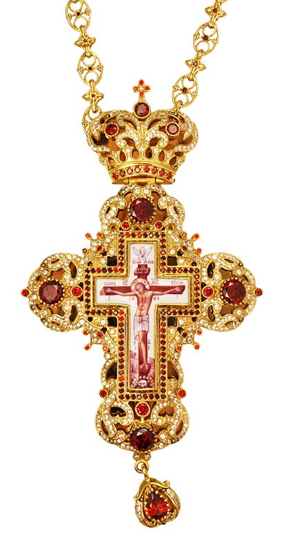 A medium Orthodox Russian-made pectoral cross. Brass, 24K gold-gilding, galvanized. The crucifixion is made in the technique of hand-painted enamel. The casted volumetric decor framing the Crucifixion is decorated with inserts of natural fianite stones. The stones are attached by hand, which guarantees their being in their places for the entire period of wearing the cross. The cross is sold in a presentable man-made leather packing with velvet lodgment. |