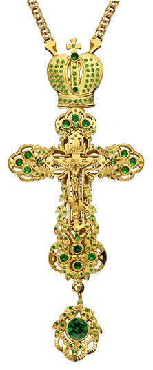 A Orthodox Russian-made Priest pectoral cross is made of brass, covered with quality gold-gilding. The product comes with chain in a presentable man-made leather packing with velvet lodgment. Excellent Russian-made item. Size: 0.4'' (10 mm).