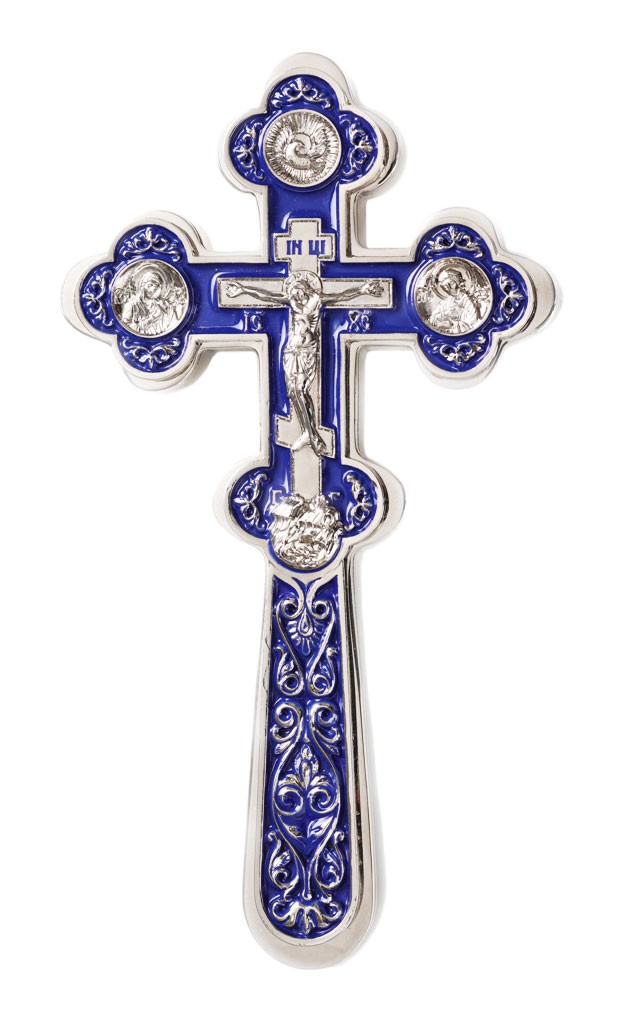 Quality traditional Orthodox Christian private service cross. Solid Russian-made item. Brass, copper, enamel, nickel-gilding. Size: 3.7''x6.7'' (9.5x17 cm).
