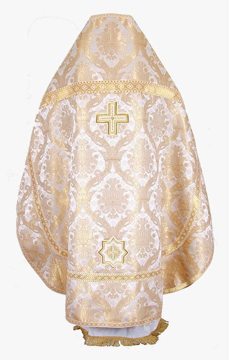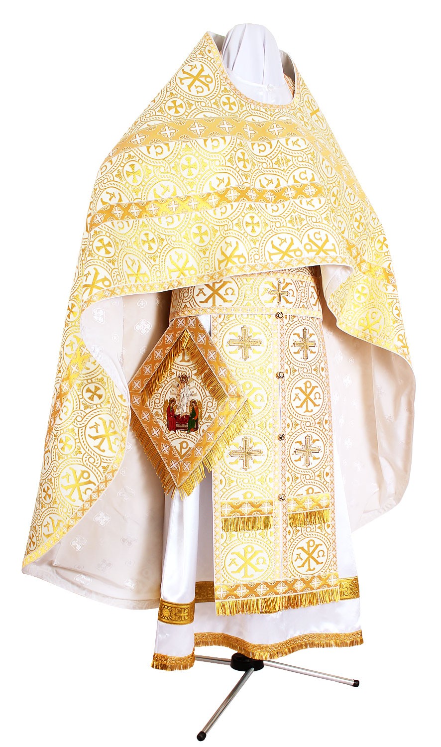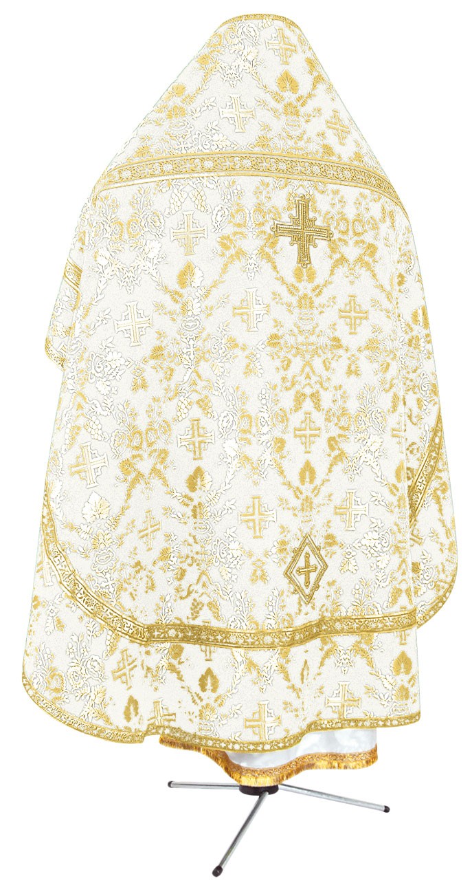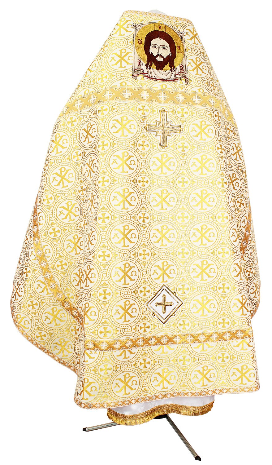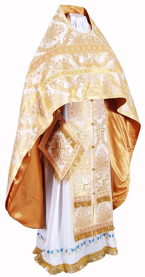 Russian Priest vestment set. Metallic jacquard brocade, class BG1. Please send us your measurements per our Measurement Chart. Please note that picture for this product is a sample one. If you would like specific fabric (in the same fabric class as this product) to be used for your order, please review Fabrics section and make a note in the Notes field of your order (at the Checkout page) which fabric you prefer. Economy vestment type (Ec) means decoration with inexpensive gallon (usually Indian) and non-embroidered crosses or crosses with inexpensive embroidery (at our discretion). For Standard style (St) we use good quality solid galloon and richly embroidered crosses. Premier stile (Pr) means decoration with excellent hand-embroidered crosses and solid jacquard galloons. Lining - 100% natural rayon. For all vestments we use natural rayon lining (no synthetics). Excellent quality natural velvet is used for inserts. This set includes 6 items: phelonion (chasuble), belt (zone), epigonation (palitsa), nabedrennik, epitralhilion, cuffs (epimanika). If you wish to order matching veils or Podriznik (alb) for this set, you need to add them to you order from the corresponding section of our store. Please indicate in the Note section of your order that these veils must match the vestment set. Washing & Care Instructions: we recommend dry cleaning, no bleach, low temperature ironing inside out. |