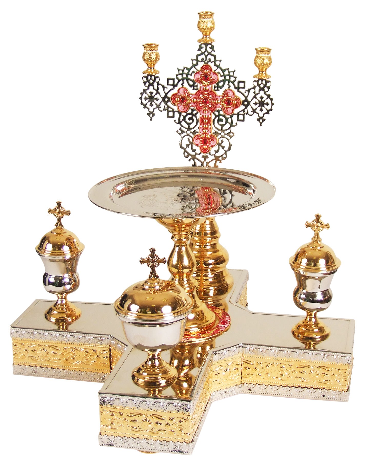 Table candle-stands Savior icon-case | Blessing cross - 22 | Czar's metallic brocade (red/gold) |
