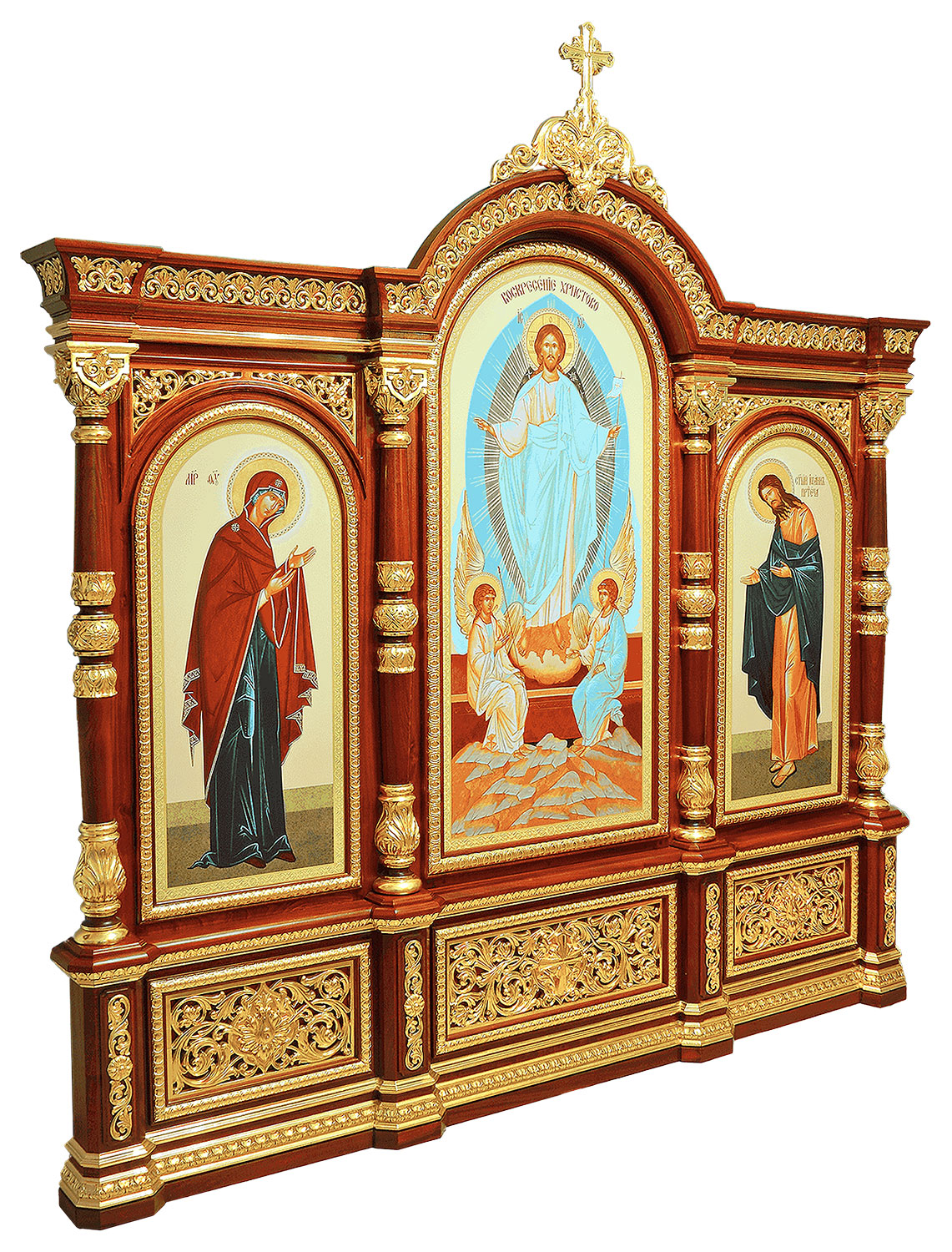 | Beautiful traditional wooden carved church icon case (kiot). Solid pinewood, carving, polishing, gold-plating, lacquering. (Icon is not included) Please inquire for custom-size. This item can be shipped only via Air Cargo. Please make sure you select this shipping option when placing your order. Size: 100.8''x112.2''x13.8'' (256x285x35 cm). |