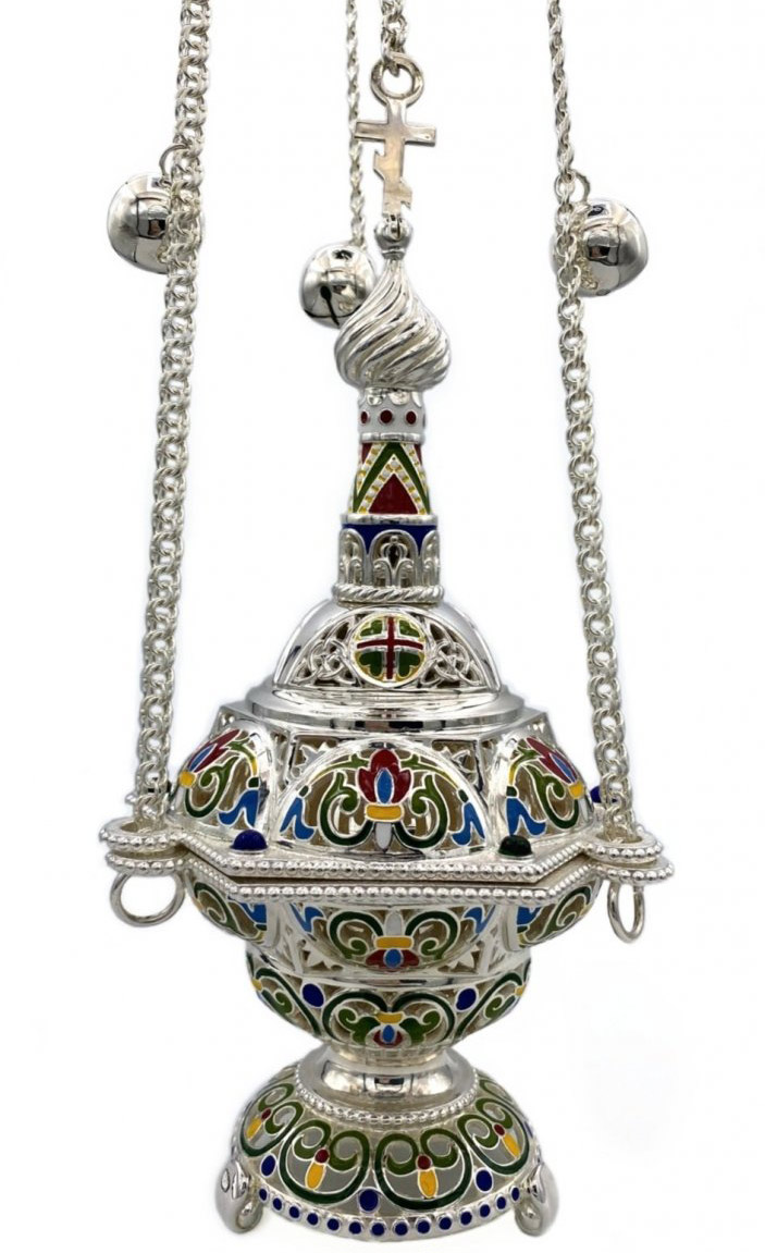 A very elegant medium-sized censer is made of brass and covered with silver-gilding applied by electroplating. This application technology guarantees an unchanged appearance of the product for a very long time and ease of care. The censer is decorated with hand-painted enamel and inserts of cubic zirconia stones and fragmentary blackening. It is manufactured using the technology of manual rotary extraction, which provides sufficiently thick walls. Thanks to this, the censer will not need to be repaired for the entire period of use due to exposure to high temperatures. The vertebrae have a very soft, melodious ringing, which is noted by all our customers. The product is packed in a presentable man-made leather package with a velvet base. Size: 4.3''x9.1'' (11x23 cm). |