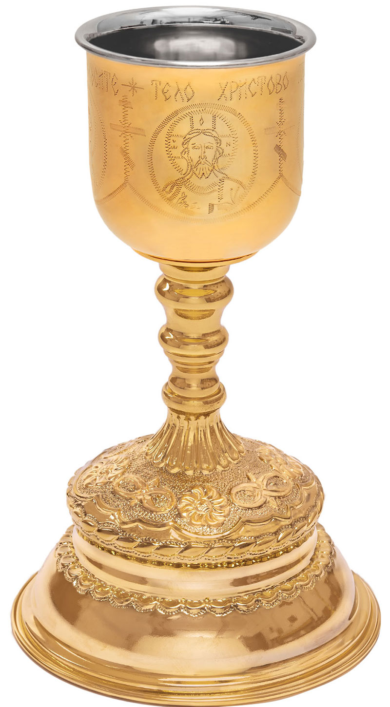 Excellent traditional Orthodox jewelry chalice. Brass, gold-gilding, stainless steel. Size: 8.3''x14.0'' (21x35.5 cm). Weight: 0.1 oz. (1.5 g).