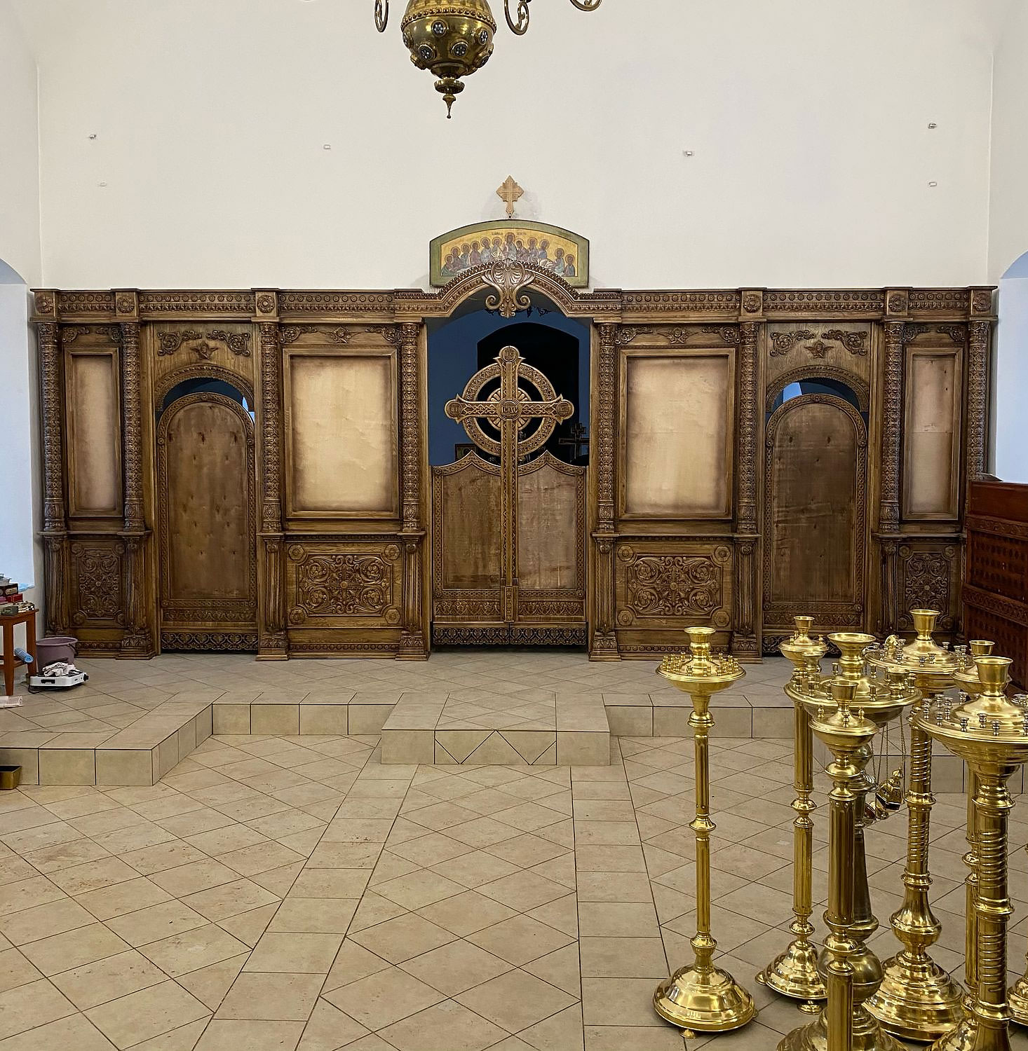 | Posad Trinity metallic brocade (blue/gold) | Pectoral cross - A323-1 | Church wall lamp - 2-010 (2 lights) |