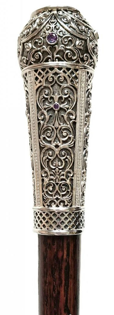Excellent, very elegant Russian-made Orthodox Christian staff. Brass, high-quality silver-gilding, galvanized. This technology guarantees an unchanging appearance of the product for a very long period of time and ease of maintenance. It is decorated with inserts of quality natural phianite stones. The wooden parts are covered with high-quality varnish in several layers. The crosier tip is also made of gilded brass, to the base of which is attached a special gasket of non-eroding material. The product is sold in a presentable man-made leather package with a velvet lodgment. Packing has locks and a special handle for easy transportation. Default length is 1.5 m, but can be custom-made in any length. |