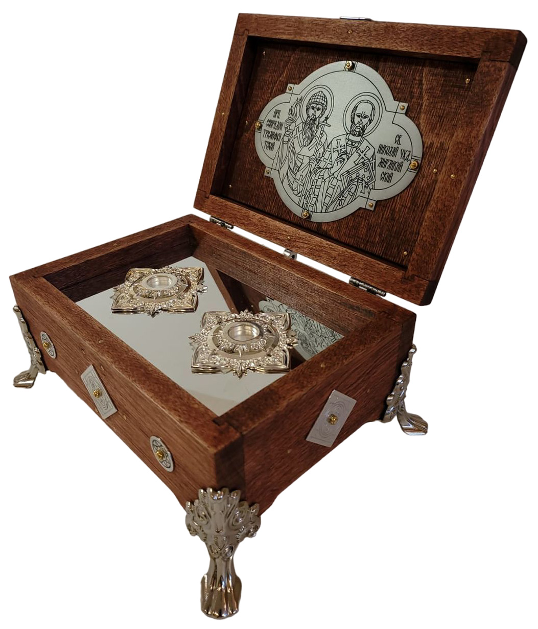 Church kiots: Pokrov carved icon case (kiot) - 2 | Pectoral chest cross - 44a | Kolomna metallic brocade (white/silver) |