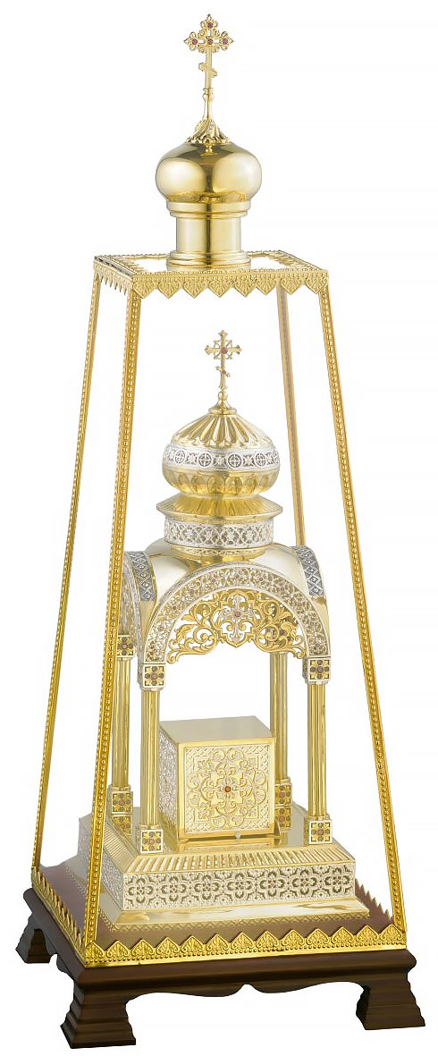 An outstanding traditional Orthodox Christian jewelry tabernacle. Brass, quality galvanized 24K gold-plating, silver-gilding, blackening, natural stones. This technology ensures a long durability and easy caring for. Icon imagery is made using a special technology of applying a color image on a brass base, it is covered with a composition that protects it from mechanical damage and exposure to light. The cover is made of organic glass. Size: 1.0''x1.0''x2.0'' (25x25x50 mm). Weight: 190.8 oz. (5410 g). |