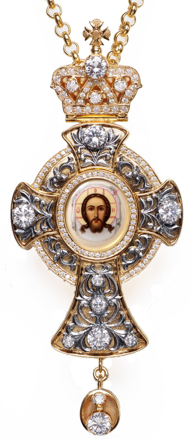 Traditional Orthodox Christian jewelry priest pectoral cross. Brass, gold-gilding, silver-gilding, phianite stones.
