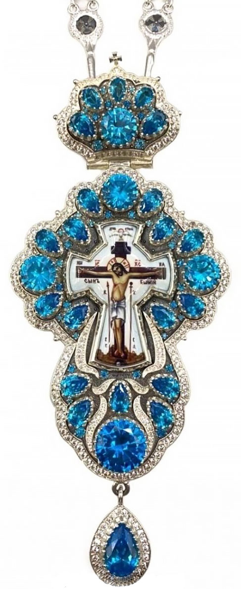Pectoral cross of the average size of the classical form is made of brass and covered with 24K silver-gilding, galvanized. The image is made using a special technology for applying a color image on a metal base. The front side of the cross is decorated with inserts of phianite stones. The cross is sold in a presentable man-made leather packing with velvet lodgment. Size: 2.6''x5.7'' (6.6x14.5 cm).