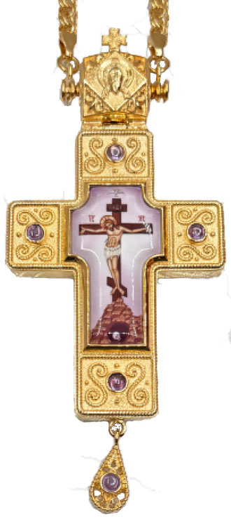 Pectoral cross of an average size of the classical form is made of brass and covered with 24K gold-gilding, casting, phianites, decole. Size: 2.9''x5.9'' (7.3x15 cm).