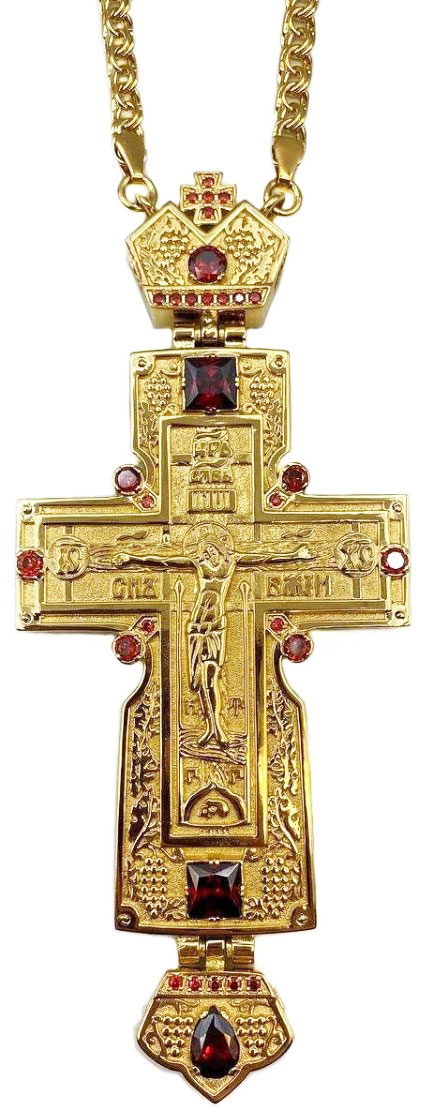This pectoral cross is made of high-quality jewelry alloy with the use of exclusively manual labor. It is covered with reliable and durable 24K gold plating with gilding elements using electroplating technology. The thickness of the coating with this application of precious metal is not less than 4 microns, which provides ease of care for the product. To return it to its original appearance - just wipe the cross with a soft dry cloth and store it without access to moisture. The front side of the cross is decorated with floral ornament with inserts of cubic Zirconia stones (phianites). The product is sold in a presentable package of man-made leather with velvet lodgment. Size: 2.4''x5.7'' (60x146 mm).