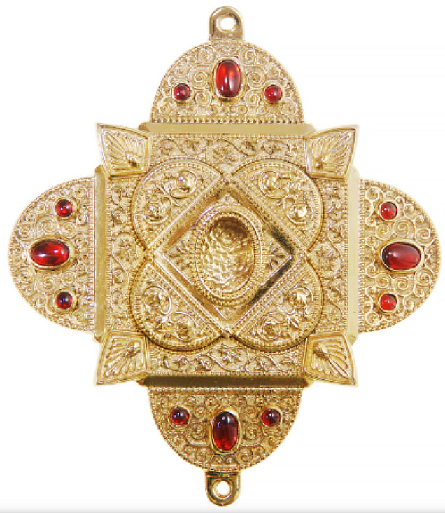 Orthodox Christian reliquary of the classical form. Brass, 24K gold-gilding, phianites. Size: 2.8''x3.3'' (7x8.5 cm).