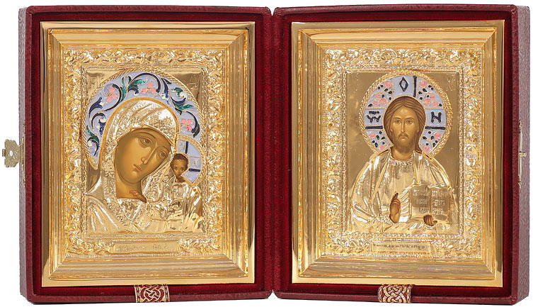 Traditional Orthodox Christian wedding icon set with canonical icon writing. Silk-print, brass, copper, gold-gilding, enamel, hand-painting. Size: 12.2''x7.1'' (31x18 cm).